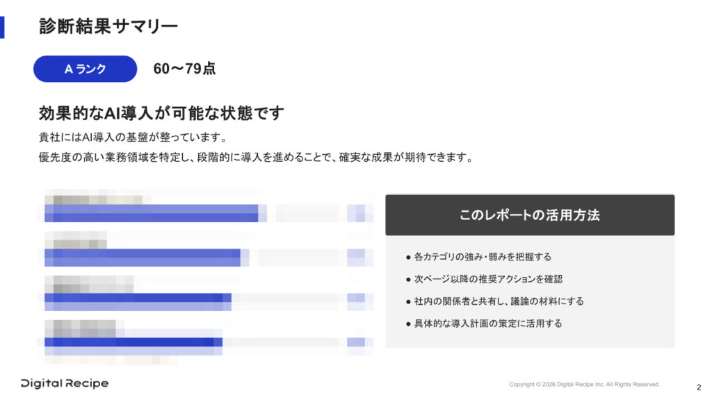 スコアを表示するだけでなく、現在の準備度において、どのようなAI活用から着手すべきかの指針を提示いたします。
