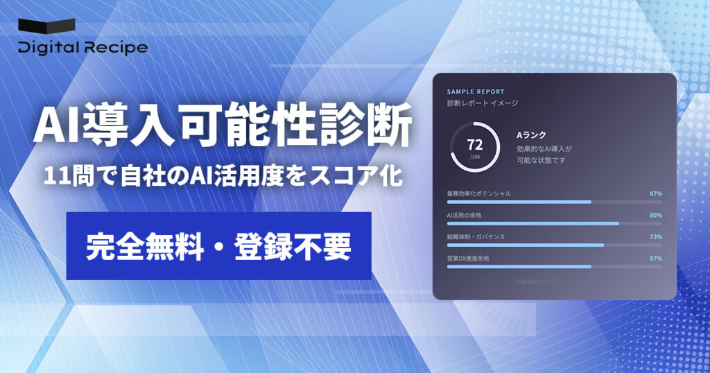 企業のAI活用を支援する株式会社デジタルレシピ(本社:東京都渋谷区、代表取締役:伊藤新之介)は、自社のAI導入準備度をわずか11問の設問でスコア化できる無料のオンライン診断ツール「AI導入可能性診断」をリリースいたしました。
